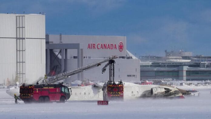கனடாவின் டொராண்டோவில் உள்ள பியர்சன் விமான நிலையத்தில் டெல்டா ஏர்லைன்ஸ் நிறுவனத்துக்கு சொந்தமான பயணிகள் விமானம் தரையிறங்கும் போது கவிழ்ந்து விபத்தில் சிக்கியது. இந்த விமானத்தில் பயணித்த 80 பேரும் உயிர் தப்பினர். காயமடைந்தவர்கள் சிகிச்சைக்காக மருத்துவமனையில் அனுமதிக்கப்பட்டுள்ளனர் என விமான நிலையத்தின் சிஇஓ தெரிவித்துள்ளார்.