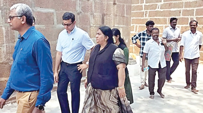 அதன்பேரில், உயர் நீதிமன்ற மதுரை கிளை சார்பில் அமைக்கப்பட்ட வழக்கறிஞர் ஆணையர் மூத்த வழக்கறிஞர் ஆனந்தவல்லி மற்றும் சென்னை ஐஐடி சார்பில் அனு சந்தானம், அருண் மேனன் ஆகியோர் தலைமையிலான குழுவினர் தென்காசி காசி விஸ்வநாதர் கோயில் வளாகத்தில் ஆய்வு செய்தனர்.