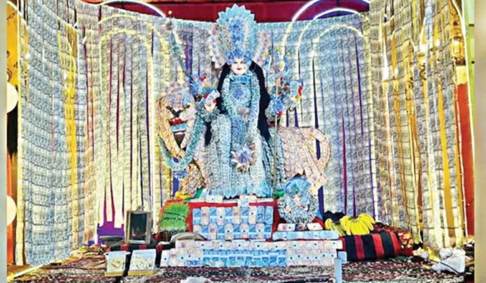 ராஜஸ்தான் மாநிலம் உதய்பூரிலுள்ள பாலேஸ்வரி மாதா தேவி சிலைக்கு பக்தர்கள் ரூ.51 லட்சம் மதிப்புள்ள கரன்சி நோட்டுகளால் அலங்காரம் செய்து உள்ளனர். புவானா பகுதியில் பிரசித்தி பெற்ற பாலேஸ்வரி மாதா கோயில் அமைந்துள்ளது. இந்த கோயிலில் தற்போது நவராத்திரி திருவிழா நடைபெற்று வருகிறது.