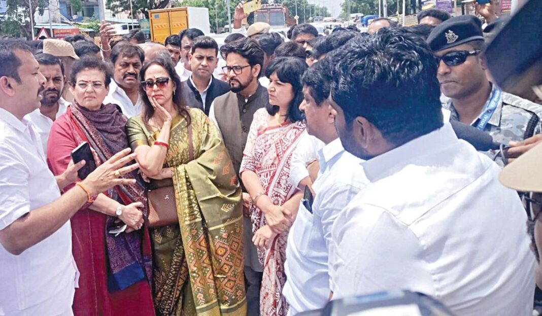 பின்​னர், எம்​.பி.க்​கள் ஹேம​மாலினி, அனு​ராக் தாக்​கூர் ஆகியோர் செய்​தி​யாளர்​களிடம் கூறிய​தாவது: இந்த சம்​பவத்​தில் உயி​ரிழந்​தவர்​களின் குடும்​பத்​தினரை சந்​தித்​த​போது, அவர்​கள் கூறு​வதைக் கேட்டு தாங்க முடி​யாத வேதனை ஏற்​பட்​டது. நிகழ்ச்​சிக்கு ஏற்​பாடு செய்​யும் அரசி​யல் கட்​சி​யினர் சரி​யான இடங்​களை தேர்வு செய்​ய​வேண்​டும்.