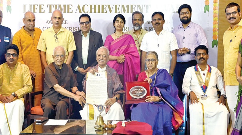 பிரபல கர்னாடக இசை மேதை டி.வி.கோபாலகிருஷ்ணனுக்கு ரோட்டரி கிளப் ஆஃப் கிண்டி சார்பில் வாழ்நாள் சாதனையாளர் விருதை, முன்னாள் தலைமை தேர்தல் ஆணையர் டி.எஸ்.கிருஷ்ணமூர்த்தி வழங்கி கவுரவித்தார்.