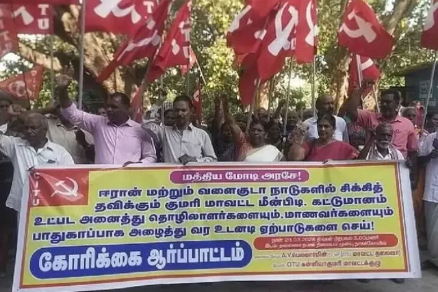 கன்னியாகுமரி மாவட்டம் நாகர்கோவிலில் அறிஞர் அண்ணா விளையாட்டு அரங்கம் அருகே சிஐடியு முன்னாள் எம்.பி பெல்லார்மின் தலைமையில் கோரிக்கை ஆர்ப்பாட்டம் நடைபெற்றது. வளைகுடா நாடுகளில் சிக்கித் தவிக்கும் குமரி மாவட்ட மீன்பிடி மற்றும் கட்டுமானத் தொழிலாளர்களைப் பாதுகாப்பாக தமிழகத்திற்குக் கொண்டுவர மத்திய அரசை வலியுறுத்தி கோஷங்கள் எழுப்பப்பட்டன. இந்த ஆர்ப்பாட்டம் நேற்று நடைபெற்றது.