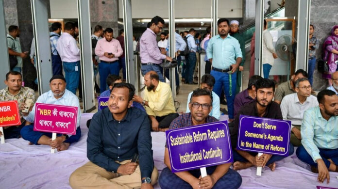 யூனுஸ் அரசு அண்மையில், தவறான நடத்தைக்காக அரசு ஊழியர்களை விசாரணையின்றி 14 நாட்களுக்குள் பணிநீக்கம் செய்யும் அவசர சட்டத்தை பிறப்பித்தது. இதற்கு எதிராக அரசு ஊழியர்கள் கடந்த சனிக்கிழமை முதல் போராட்டத்தில் ஈடுபட்டுள்ளனர். இதனால் அரசுப் பணிகள் முடங்கியுள்ளன.