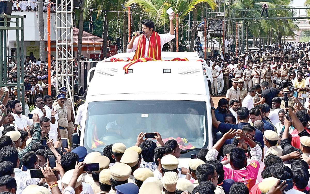 காலை 10 மணியில் இருந்து பிற்பகல் 1 மணிக்குள் கூட்டத்தை முடித்துக் கொள்ள வேண்டும் என்று போலீஸார் நிபந்தனை விதித்தனர். இதையடுத்து, காலை 10 மணி அளவில் விஜய் வருவார் என எதிர்பார்க்கப்பட்டது. ஆனால், வழிநெடுகிலும் ஏராளமான தொண்டர்கள், பொதுமக்கள் திரண்டிருந்ததால், சந்திப்பு கூட்டம் நடைபெறும் இடத்துக்கு விஜய் வந்துசேர்வதில் தாமதம் ஏற்பட்டது. சுமார் 2 மணி நேரம் தாமதமாக, பிற்பகல் 12.40 மணி அளவில் அவர் அங்கு வந்து சேர்ந்தார்.