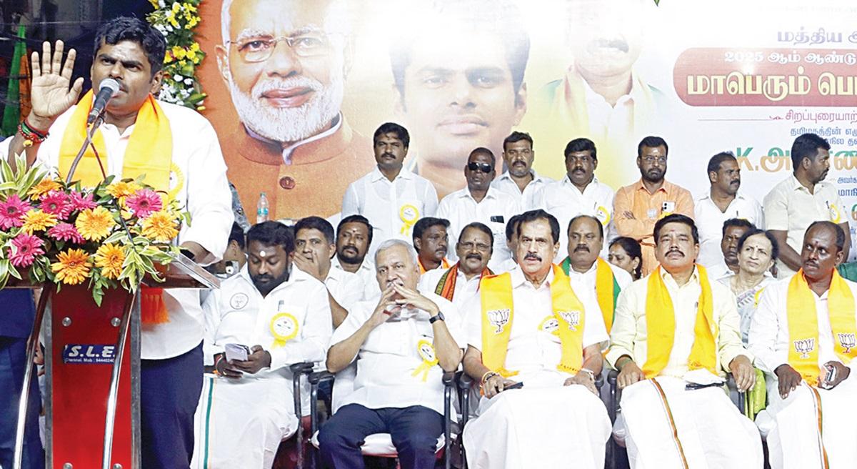 முன்னாள் தலைவர் தமிழிசை பேசும்போது, “ஆன்மிகம்தான் தமிழகத்தை காக்கப் போகிறது. பாஜகதான் தமிழகத்தை ஆளப்போகிறது. இந்த அக்காவும், தம்பி அண்ணாமலையும் சேர்ந்து ஸ்டாலினை வீட்டுக்கு அனுப்புவோம். அண்ணா வளர்த்தது தமிழ் அல்ல. ஆண்டாள் வளர்த்ததுதான் தமிழ் என தெரிய வேண்டும். பெரியார் வளர்த்தது தமிழ் அல்ல, பெரியாழ்வார் வளர்த்தது தான் தமிழ் என அவர்கள் புரிந்து கொள்ள வேண்டும்” என்றார்.