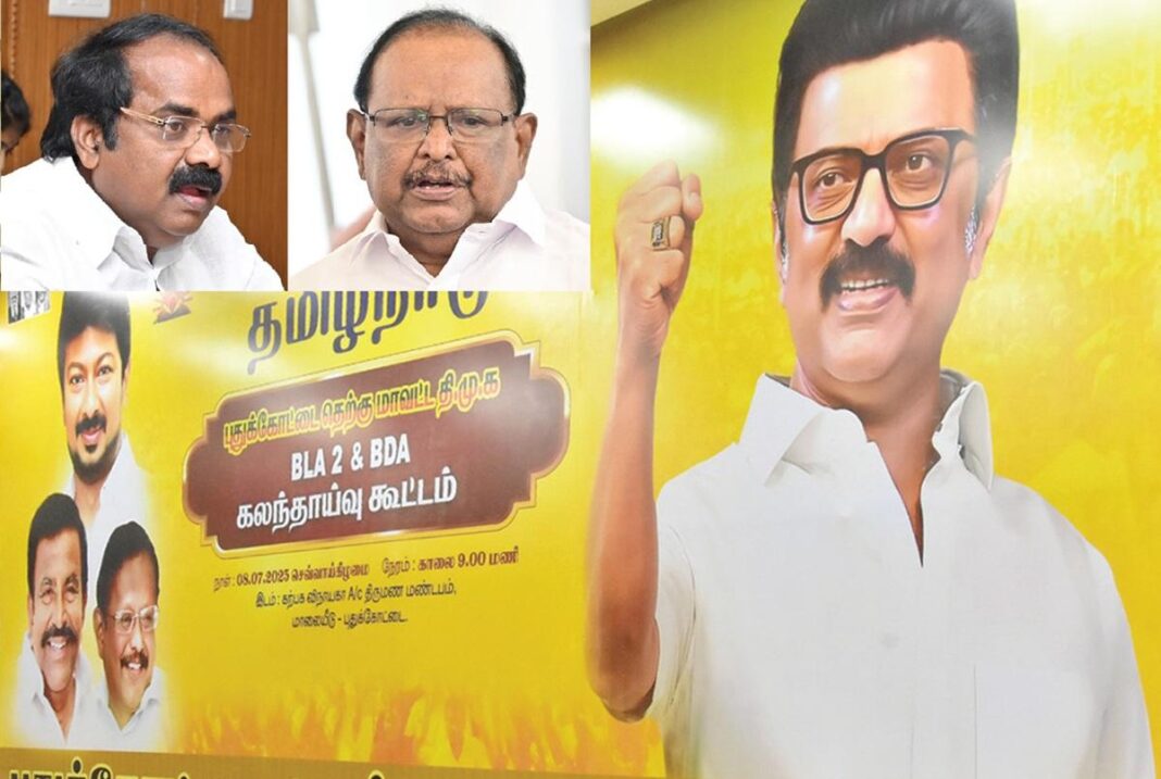 புதுக்கோட்டை மாவட்ட திமுக-வில் அமைச்சர்கள் ரகுபதியும் சிவ.வீ.மெய்யநாதனும் அசைக்கமுடியாத சக்தியாக இருப்பவர்கள். இதில், ரகுபதி புதுக்கோட்டை தெற்கு மாவட்ட திமுக செயலாளராகவும் இருப்பதால் கூடுதல் அதிகாரத்துடன் கோலோச்சி வருகிறார். இதனால் அவரது மாவட்டத்துக்கு உட்பட்ட ஆலங்குடி தொகுதியின் எம்எல்ஏ-வான அமைச்சர் மெய்யநாதனை ரகுபதி தரப்பு திட்டமிட்டு புறக்கணித்து வருவதாகச் சொல்கிறார்கள்.