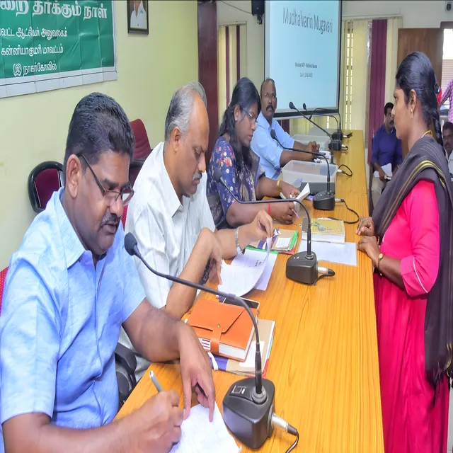 கன்னியாகுமரி மாவட்டம் நாகர்கோவில் ஆட்சியர் அலுவலக நாஞ்சில் கூட்டரங்கில் நேற்று (ஜனவரி 13) நடைபெற்ற மக்கள் குறைதீர்க்கும் நாள் கூட்டத்தில், மாவட்ட ஆட்சித்தலைவர் அழகுமீனா பொதுமக்களின் கோரிக்கை மனுக்களை பெற்றுக்கொண்டார். உடன் மாவட்ட வருவாய் அலுவலர் ஜெ. பாலசுப்பிரமணியம் உட்பட பலர் இருந்தனர். கோரிக்கைகளுக்கு விரைவில் தீர்வு காணும்படி அதிகாரிகளுக்கு அறிவுறுத்தினார்.