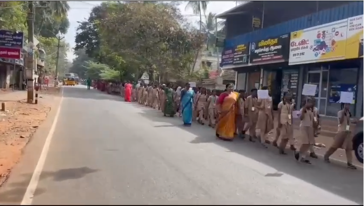 குளச்சலில் சாலை பாதுகாப்பு மாதத்தை முன்னிட்டு மாவட்ட எஸ்பி ஸ்டாலின் உத்தரவின்படி குளச்சல் ஏஎஸ்பி பிரவீன் கௌதம், போக்குவரத்து காவல் இன்ஸ்பெக்டர் சந்தனகுமார் ஆகியோர் மேற்பார்வையில் நேற்று பள்ளி மாணவர்களின் போக்குவரத்து விழிப்புணர்வு பேரணி குளச்சலில் நடந்தது. விகேபி மேல்நிலைப்பள்ளி மைதானத்தில் தொடங்கிய இப்பேரணியை தலைமை ஆசிரியர் இளங்கோ கொடியசைத்து தொடங்கி வைத்தார். பேரணியானது போக்குவரத்து சப்-இன்ஸ்பெக்டர் சிதம்பரநாதன், சுரேஷ்குமார் ஆகியோர் தலைமையில் அண்ணா சிலை சந்திப்பு, காமராஜர் பஸ் ஸ்டாண்ட் வழியாக காந்தி சந்திப்பு சென்று மீண்டும் பள்ளி மைதானம் சென்றடைந்தது. மாணவர்கள் ‘தலைக்கவசம் உயிர்க்கவசம்’ என கோஷமிட்டு சென்றனர். சுமார் 500க்கும் மேற்பட்ட மாணவர்கள் உட்பட ஆசிரியர்கள் கலந்து கொண்டனர்.