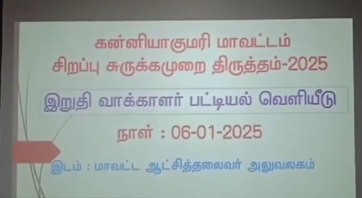 கன்னியாகுமரி மாவட்டத்தில் புதிய வாக்காளர் பட்டியலை நேற்று (ஜனவரி 6) மாவட்ட ஆட்சியர் அழகுமீனா வெளியிட்டார். அதில் மாவட்டத்தில் 2024 ன்படி மொத்த வாக்குச்சாவடிகளின் எண்ணிக்கை 1698 என்றும், தற்போது உள்ள வாக்குச்சாவடி எண்ணிக்கை 1702 என்றும் கிள்ளியூர் தொகுதியில் புதிதாக 2 வாக்குச்சாவடிகளும், பத்மநாதபுரம் தொகுதியில் 2 வாக்குச்சாவடிகளும், மொத்தம் 4 வாக்குச்சாவடிகள் புதிதாக உருவாக்கப்பட்டுள்ளது என்றார்.