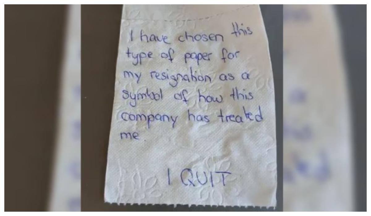 வைரலாகி வரும் அந்த ராஜினாமா கடிதத்தில், “நான் தேவைப்படும்போது பயன்படுத்தப்படும் கழிப்பறை காகிதத்தைப் போல உணர்ந்தேன், எந்தவொரு இரண்டாம்பட்ச சிந்தனையைக் கூட இல்லாமல் தூக்கி எறியப்பட்டேன்” என கவலையுடன் பதிவிட்டுள்ளார். மேலும், “இந்த நிறுவனம் என்னை எவ்வாறு நடத்தியது என்பதற்கான அடையாளமாக தான், இந்த வகையான காகிதத்தை எனது ராஜினாமா கடிதத்தை எழுத தேர்ந்தெடுத்துள்ளேன்” என்று எழுதப்பட்டிருந்தது. இது தொடர்பான பதிவு சமூக வலைதளத்தில் வேகமாக பகிரப்பட்டு வருகிறது. அந்த ஊழியருக்கு ஆதரவாக நெட்டிசன்கள் குரல் கொடுத்து வருகின்றன.