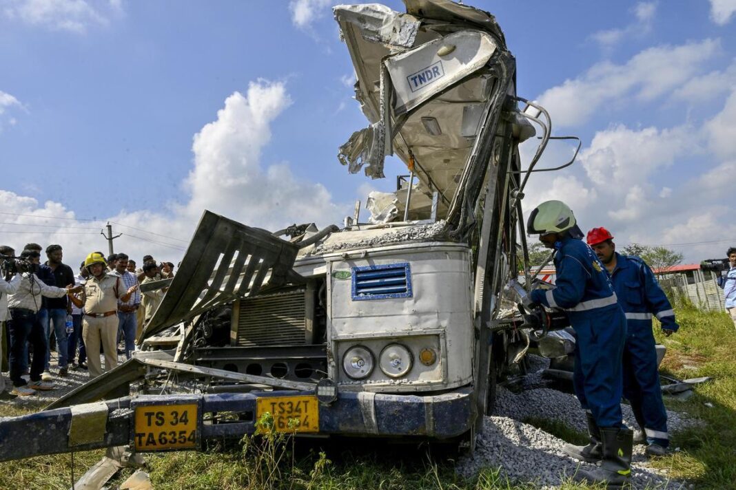 ஹைதராபாத் அருகே நடந்த கோர விபத்தில் 21 பேர் பரிதாபமாக உயிரிழந்தனர். தெலங்கானா மாநிலம் ஹைதராபாத் அடுத்துள்ள ரங்காரெட்டி மாவட்டம், தாண்டூருவிலிருந்து நேற்று அதிகாலை 4.40 மணிக்கு தெலங்கானா அரசு பேருந்து ஹைதராபாத் நோக்கி புறப்பட்டது. 52 பேர் அமர கூடிய அந்த பேருந்தில் 72 பேர் பயணம் செய்தனர்.