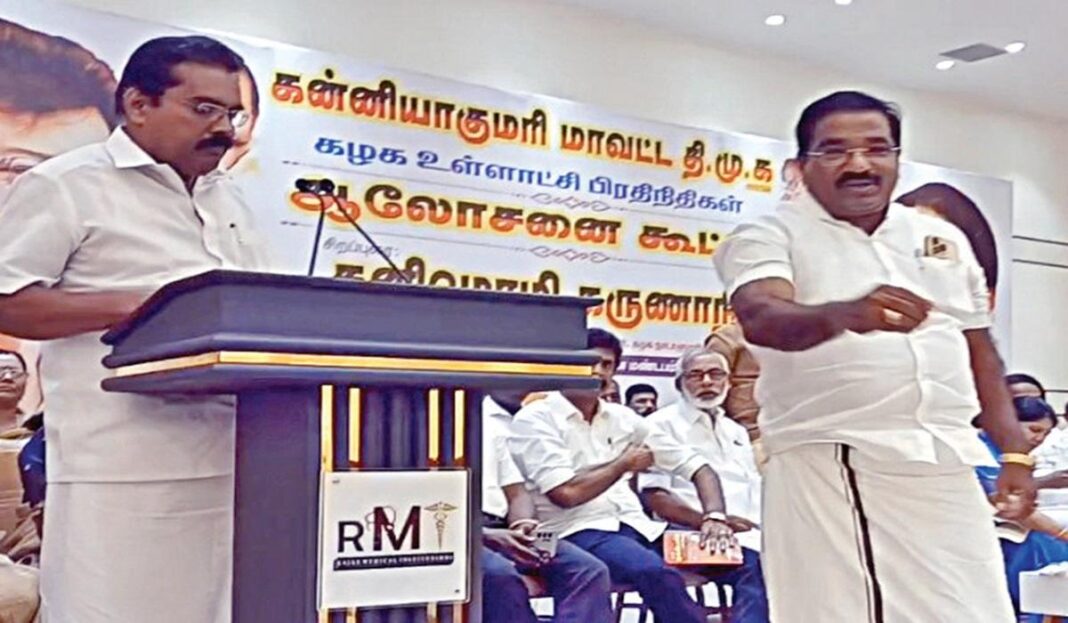அக்டோபர் 26-ம் தேதி நாகர்கோவிலில் நடந்த கன்னியாகுமரி மாவட்ட உள்ளாட்சி பிரதிநிதிகள் ஆலோசனைக் கூட்டத்தில் கனிமொழி எம்.பி., பால்வளத் துறை அமைச்சர் மனோதங்கராஜ், நாகர்கோவில் மேயர் மகேஷ், முன்னாள் அமைச்சர் சுரேஷ்ராஜன் ஆகியோர் மேடையில் அமர்ந்திருந்தனர்.