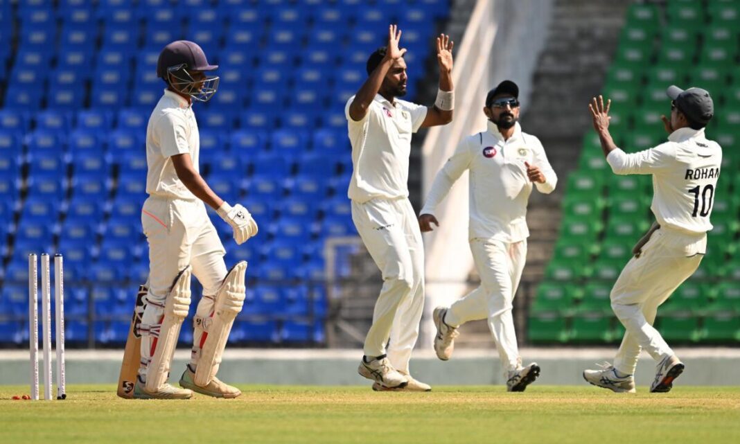 யாஷ் தாக்குர் 25, யாஷ் ரத்தோடு 3, கேப்டன் அக்சய் வத்கர் 23, அக்சய் கர்னிவர் 12, நச்சிகேத் பூதே 32 ரன்களில் ஆட்டமிழந்தனர். கேரளா அணி தரப்பில் நிதீஷ், ஈடன் ஆப்பிள் டாம் ஆகியோர் தலா 3 விக்கெட்களை வீழ்த்தினர். நெடுமங்குழி பாஸில் 2 விக்கெட்களை கைப்பற்றினார். இதையடுத்து விளையாடிய கேரளா அணி 2-வது நாள் ஆட்டத்தின் முடிவில் 39 ஓவர்களில் 3 விக்கெட்கள் இழப்புக்கு 131 ரன்கள் எடுத்தது. அக்சய் சந்திரன் 14, ரோகன் குன்னுமால் 0, அகமது இம்ரான் 37 ரன்களில் ஆட்டமிழந்தனர்.