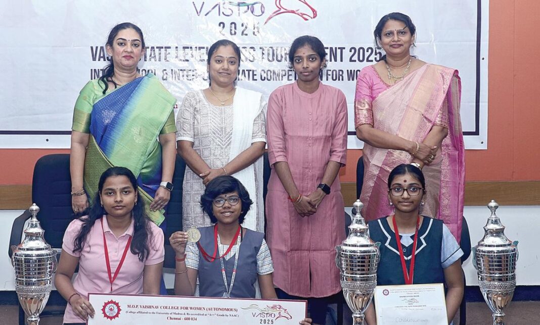 எம்ஓபி வைஷ்ணவா மகளிர் கல்லுாரி சார்பில் வாஸ்போ மாநில அளவிலான கல்லூரிகள், பள்ளி மாணவிகளுக்கான செஸ் போட்டி சென்னை நுங்கம்பாக்கத்தில் நடைபெற்றது. இதில் கல்லூரிகள் பிரிவில் 150 பேரும், பள்ளிகள் பிரிவில் 300 பேரும் பங்கேற்றனர். கல்லூரிகள் பிரிவில் நாகர்கோவிலை சேர்ந்த ரெபேக்கா ஜெசுமரியன் (ஹோலி கிராஸ்) சாம்பியன் பட்டம் வென்றார். பள்ளி மாணவிகளுக்கான 18 வயதுக்குட்பட்டோர் பிரிவில் கீர்த்தி ஸ்ரீ ரெட்டியும் (வேலம்மாள் மெட்ரிகு ரிகு லேசன்), 15 வயதுக்குட்பட்டோர் பிரிவில் தீபிகாவும் (வேலம்மாள் வித்யாலயா) முதல் இடத்தை பிடித்தனர்.